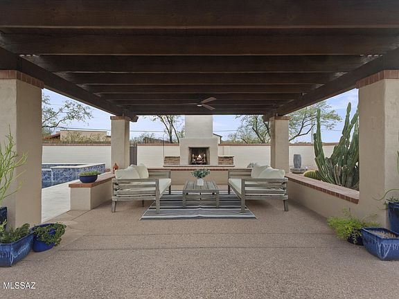 Exceptional home in sought after guard-gated Tucson Country Club Estates. This 4 bed/3 bath home has been lovingly upgraded with a professionally landscaped front yard plus beautifully designed backyard featuring recently installed WIFI controlled pool/spa and adjacent lighted ramada which boasts a sensational outdoor fireplace. Spacious primary suite incorporates beamed ceiling, gas fireplace, spacious closet off the en suite bath. Chef's kitchen includes Monogram/Bosch appliances, ample storage and views to backyard oasis. Enjoy your Spanish tile, custom alder doors, and new full-home water filtration and Dual HVAC systems offer year-round comfort. HOA-previously approved architectural plans are available for a new 3-car g A new live-in suite is envisioned in architectural plans for the existing garage. Further, the lot size offers opportunities for other additions.