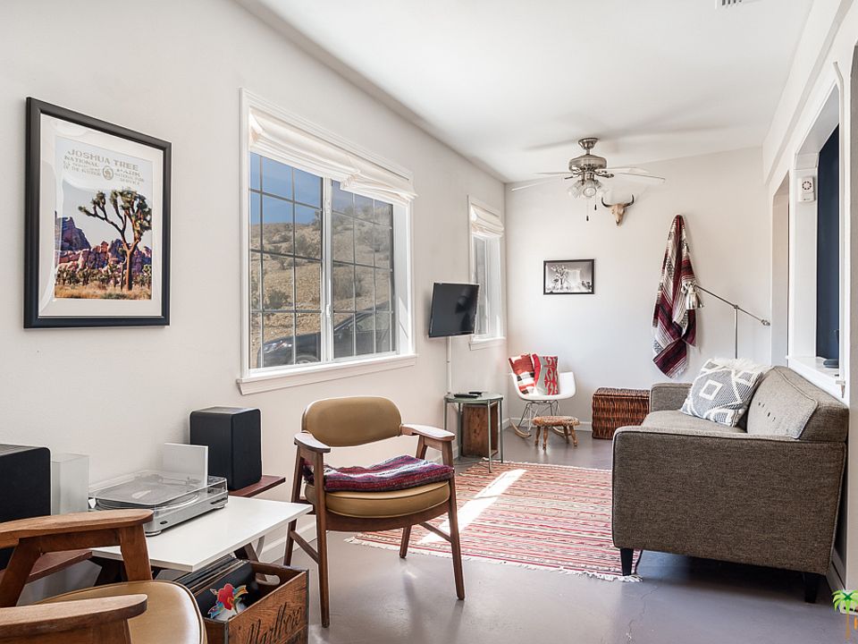 PURE CHARM describes this JOSHUA TREE property Nestled on 2.5 acres in one of the most sought after neighborhoods in town, this remodeled 2-bedroom home built in 1957 features a large master bedroom and a second bedroom surrounding an open-concept living, dining, office and kitchen space (modern appliances and new dishwasher - 2019), as well as one full bathroom with shower/tub. A detached fully finished studio with french doors overlooking the town of Joshua Tree, usable as an office, a yoga studio, or workshop, adds approximately 300 sq feet of additional living space. Outside, enjoy peace and quiet from the covered back porch, take in the breathtaking night skies from the hot tub (hot tub new in 2016), and dramatic desert sunrises with 360 degree views atop the hill. Secluded yet close to downtown and JTNP on a well-maintained road, the property overlooks the village valley from its quiet, private location dotted with Joshua Trees. Beautifully maintained one of a kind property!