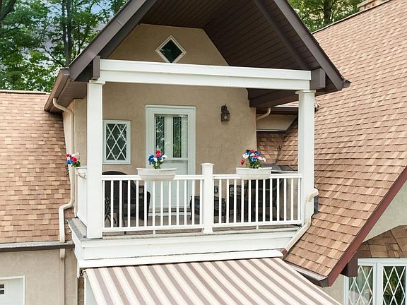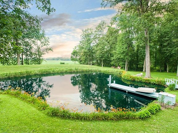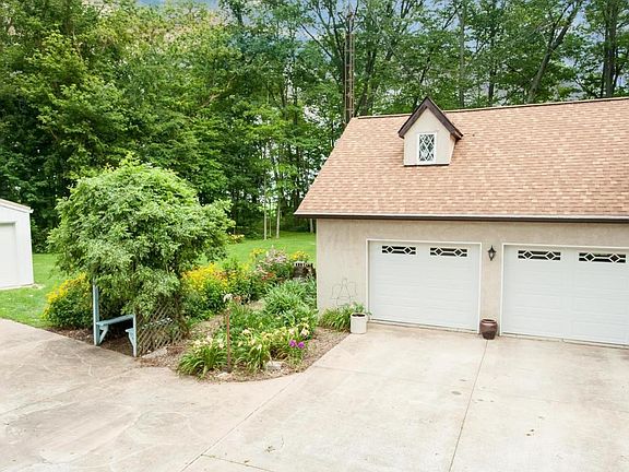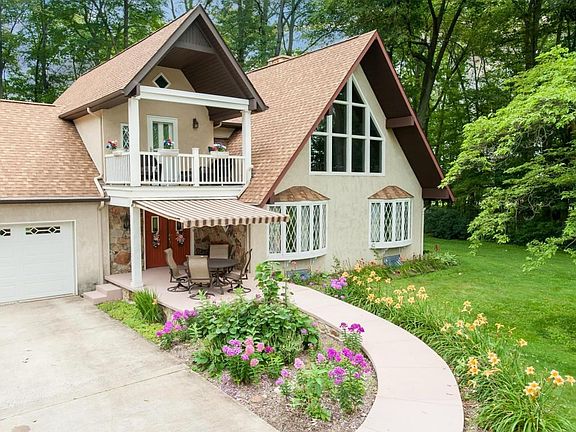 SHOWINGS START 7/17/17 - This majestic Chalet-style home is situated on 5+ GORGEOUS acres w/woods, a 1/3 acre stocked pond w/waterfall feature, mature trees, extensive landscaping and wild flowers! Also featuring a 46' X 36' outbuilding w/3 separate sections. This UNIQUE and one-of-a-kind property features a stone/stucco exterior, dramatic 4-ft overhang, expansive windows, hardwood floors, two story great room with over-looking loft, exposed flr to ceiling stone chimney, and 2nd flr owners suite w/expansive bath leading to the private balcony! The deluxe master bath features a heated soaking tub and double vanity! The fully equipped kitchen is highlighted w/quartz counters and a center island w/prep sink. 1st flr laundry/mud room and updated 1st flr bath! Partially finished LL too!