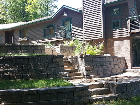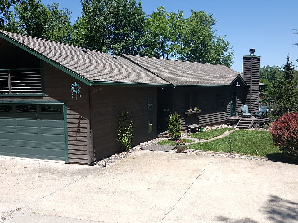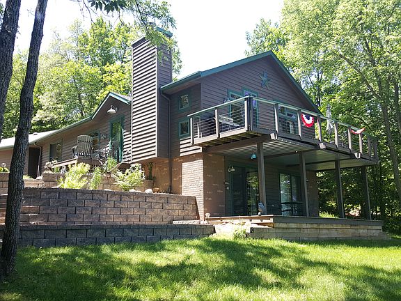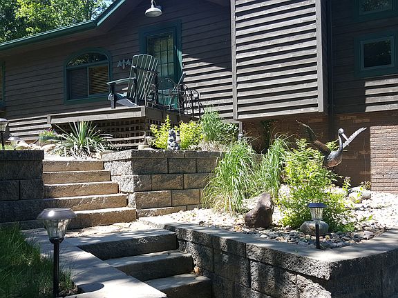 Waterfront, 3 bedroom - 3 Bath - GREAT WATER VIEWS! Year round Home with a Cabin Feel for your enjoyment every season! MOVE IN READY and enjoy Lake Living! Modular cabin/home built 2002. Approx 2400 Total Sq Ft up and down. ML Entry with large vaulted GR RM with wood fireplace and LOTS OF GLASS to the lake. Updated stainless steel appliances. LL offers Fam Rm with electric fireplace, bedroom or office with cedar closet, 3/4 BA plus walk in sauna. Sliders to wood patio main and lower level. Shoreline rip-rapped plus additional rock wall leaving flat area by waterside for Mirage Stone outside wood burning fireplace! Attached 674 Sq Ft garage with large loft area - door off loft area to private covered balcony. Beautifully landscaped. Washer, dryer, boat lift/motor included.