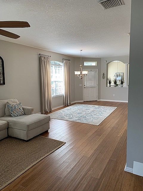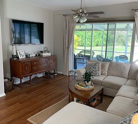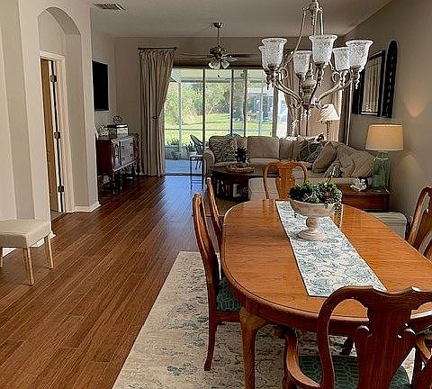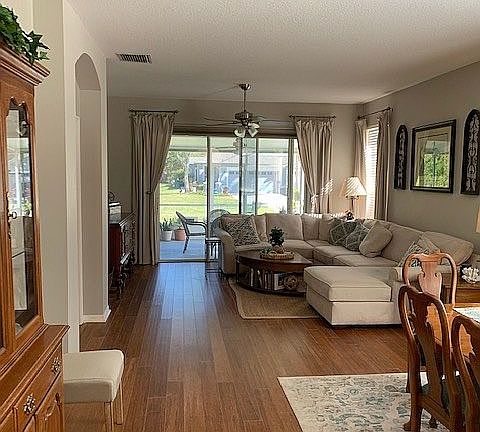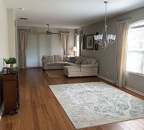 Fishhawk Ranch's much sought after SANDHILL VILLAS, end unit, beautiful double lot, cul-de-sac, magnolia and oak trees; gated, quiet community with pool; Bevis elementary school. Entrance foyer opens into bright, open dining/living room with bamboo flooring (2018), 3 panel sliders open to huge covered patio/lanai with extended back lawn & conservation area. Separate bright dinette area; Kitchen with generous cabinets and granite counters, under counter lighting, stainless appliances (2017 French door refrigerator and double oven), breakfast bar. Split floor bedroom with extended Owners retreat with sitting area, 3 panel sliders to huge patio/lanai, walk-in and reach- in closets, dual sink in owners bath with separate shower and garden tub; bedrooms 2 & 3 share guest bath with marble counter; 3rd bedroom has office built-ins and bamboo floor with double door entry; hall has built in desk/drop zone;. Inside laundry room with cabinets. Two car garage with laundry tub, wire storage shelving along both walls, remote and touch pad entry, gas hot water heater (2017); water softener. HOA includes external and yard maintenance, 2016 roof, 2020 exterior paint, CDD fees included in taxes. FHR offers 20 miles of walking/running/ biking trails, several resort style pools, fitness centers, tennis courts, skate park, basketball courts, playgrounds, fishing ponds, and green spaces. Come live the FH life!!