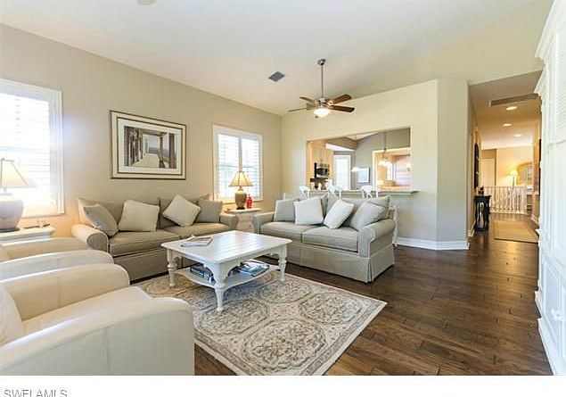 C.11015 - Wonderful 2nd floor corner residence in private setting with properties on only one side of street. Gorgeous upgraded kitchen cabinetry, granite counters and stainless steel appliances. Rich looking hardwood floors throughout living, dining and kitchen areas. New carpeting in stairwell, neutral and casual feel with quality furnishings and accessories, Plantation shutters in every room and seamless decor throughout. Tiled lanai with storm shutters in place. Lovely golf course views, fantastic location and low density community. Large 2 car garage and great driveway space. One year home warranty included.
