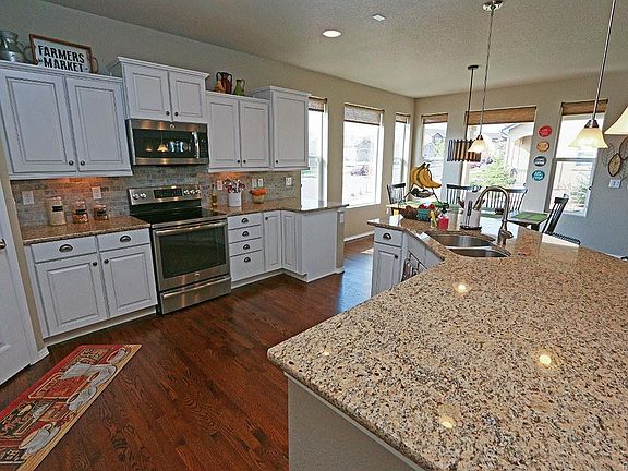 Absolutely beautiful stucco home on a south facing corner lot. This home has been meticulously maintained, it is spotless and shows like a model with upgrades throughout. It has gorgeous wood floors, accented by the stone fireplace in the family room, the kitchen is stunning with its soft close antique white cabinets, travertine silver mosaic tile back splash, huge island with breakfast bar, window coverings, top of the line counter depth refrigerator, extended covered patio wired for ceiling fan, security system, the home is wired for surround sound, large family/rec room in finished basement. This home is a must see!