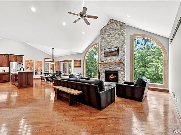 Discover this custom ranch home on nearly 6 acres in Desloge Estates, offering the perfect blend of country charm and modern convenience. With 4 bedrooms, 4 full baths, and 3,803+/- sqft of living space, this home is designed for comfort, entertaining, and everyday living. A circle drive, attached 3-car garage, and Brand- New 2024 detached 30'x40' outbuilding/workshop providing parking and storage. Recent upgrades — new roof & gutters (2023), LP siding (2023), geothermal system (2022), and $240k+ in improvements — ensure move-in readiness. Inside, enjoy soaring ceilings, hardwood flooring & abundant natural light. The living room features a 16’ vaulted ceiling, floor-to-ceiling stone fireplace & large picture windows. The kitchen shines with new quartz countertops, custom cabinetry, wet bar, vaulted ceiling & some new appliances. The primary suite boasts a vaulted ceiling, walk-in closet, and ensuite with double vanities, jetted tub, and shower. A second bedroom with built-ins and armoir for closet plantation shutters while a sunroom and laundry complete the main level.The walk-out lower level offers a rec room w/fireplace, kitchenette, two additional bedrooms (one ensuite), hall bath, and two storage rooms, including one with a large safe that stays. Step outside to nearly six rolling acres & enjoy the shared community lake just steps away. Conveniently located minutes from Hwy 44, Shaw Nature Reserve, & 15 minutes to shopping & dining, this move-in-ready home is a must-see