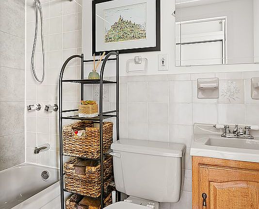An interior stairwell and hallway connects both floors of this duplex. As soon as you open the door, you step into a beautiful and quaint home office (very Harry Potter!) with floor to ceiling custom built-in solid maple shelves. On each side of the office, there are two large bedrooms. The primary includes two walls of built-in custom maple closets as well as a matching bed and a tranquil en-suite green tile bathroom with separate shower and tub. On the other side of the office is an additional bedroom with high ceilings that is currently set up with a twin bunk bed and built-ins. This room can comfortably fit two twin beds or could accommodate a king-sized bed.