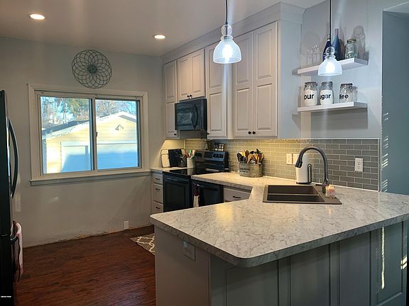 Here is the house you've been looking for! A cozy home with an enclosed front porch, stunning kitchen remodel, newer furnace, flooring, and shingles, and potential for a 4th bedroom in the basement. Beautiful built in cabinets and storage room galore! Plenty of work space with 3 stalls of garage (including a furnace and air conditioner) and extra parking space for those big toys. Newer kitchen appliances. Priced right and ready for new owners! Call today for your showing.