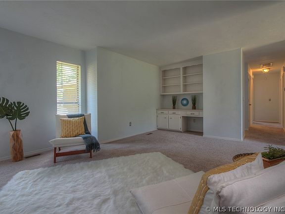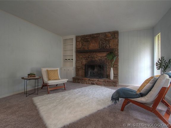 Living includes wood burning stone fireplace with built-in bookcase and built-in desk area. Dining open to kitchen w/sliding door to patio & casual breakfast bar seating. New carpet throughout & updated HVAC. Neighorhood park entrance across the street.
