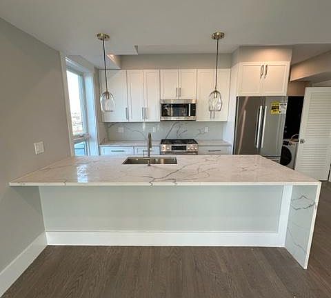 Luxury New Construction Building offering condo quality finishes! This is a corner 1 bedroom 1 bathroom unit, with plenty of natural sunlight and direct views of Boston Skyline. Open kitchen, living and dining room is a perfect space for entertaining. The kitchen has high end Bosch appliances, marble countertops and bar concept seating complete this chef's kitchen. The bedroom has an over sized walk in closet. Laundry in unit, central ac, and hardwood flooring throughout. Building will be completed within the next two weeks and is available for showings now! Don't miss out on this opportunity to be the first to live in this stunning apartment! Flexible Lease Terms and Start Date!