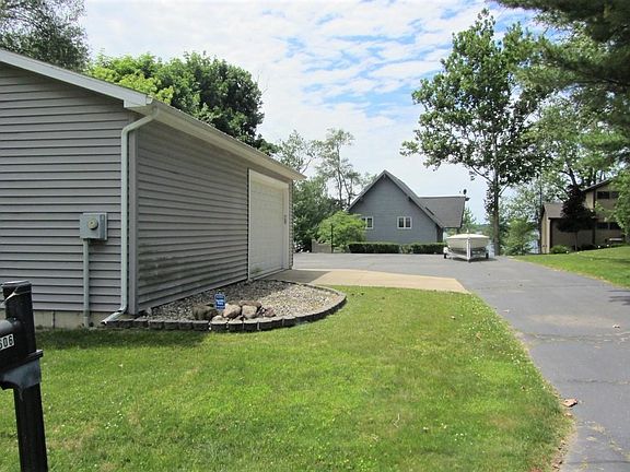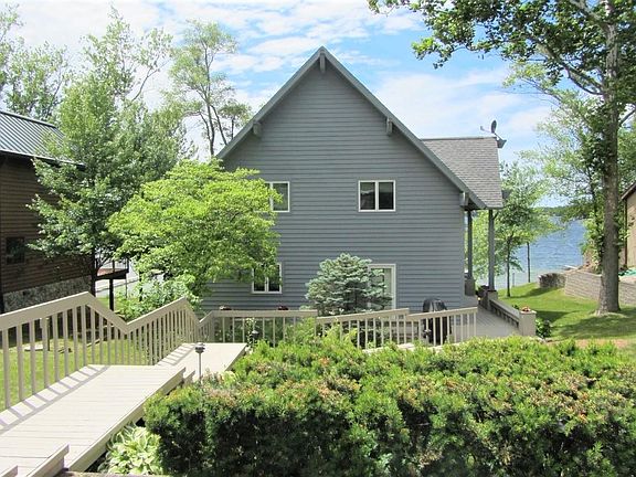 62.85' of lakefront on Clear Lake's east side! Perfect sand beach and fantastic sunset views! An amazing open concept 3 bedroom 3.5 bath home. The great room features a two story cathedral ceiling, fieldstone gas log fireplace, custom built-in cabinetry with granite tops, a wall of windows to enjoy the lake views and is open to the dining area and kitchen. The kitchen has an island breakfast bar, Kraft Maid cabinetry with pull outs and pantry, granite counter tops, stone backsplash, copper sink, Wolf gas cook-top, Wolf dishwasher, built-in wall oven & microwave, beverage cooler and wine cooler. Hardwood flooring throughout the great room, dining area, kitchen and foyer entry. There is a half bath with tile flooring and copper sink off the kitchen. Main level bedroom suite with slider to the deck includes a full bathroom with tile flooring, tile walk-in shower, custom cabinetry and Corian vanity top. The lower level family room has tile flooring, built-in book shelves and a flat screen TV. There's another guest bedroom with tile flooring, full bathroom with tile flooring and shower, mechanical room and a laundry closet. The upper level consists of a large loft area overlooking the great room and the master suite with 2 large walk-in closets, stackable washer/dryer and a bathroom with twin vanities, tile flooring, soaking tub and a tile walk-in shower. The lakeside deck includes a built-in hot tub with cover and lots of area to entertain. The .51 acre lot gives you plenty of yard lakeside and on the roadside. There is a 30x40 detached garage for all the water toys and extensive parking.