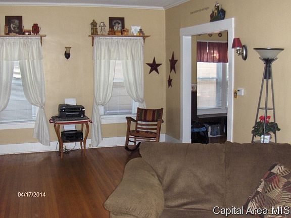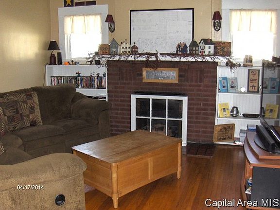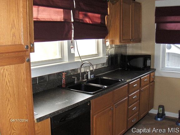 Many updates by current owners. All new replacement windows (double hung vinyl tilt in). Blown in insulation in side walls. New siding & garage roof in 2012. Guttering. New water line from street into home. New Electrical Box w/ space for more . Shelves in living room remain. New cabinets and built in dish washer. Appliances remain. (stove & refrigerator) Gas log fireplace has not been used by current owners. Privacy fenced rear . Poured patio. Small shed remains. Recent sewer tap in alley. Large detached 2.5 Car Garage. 1 YR Home Warranty provided at closing.