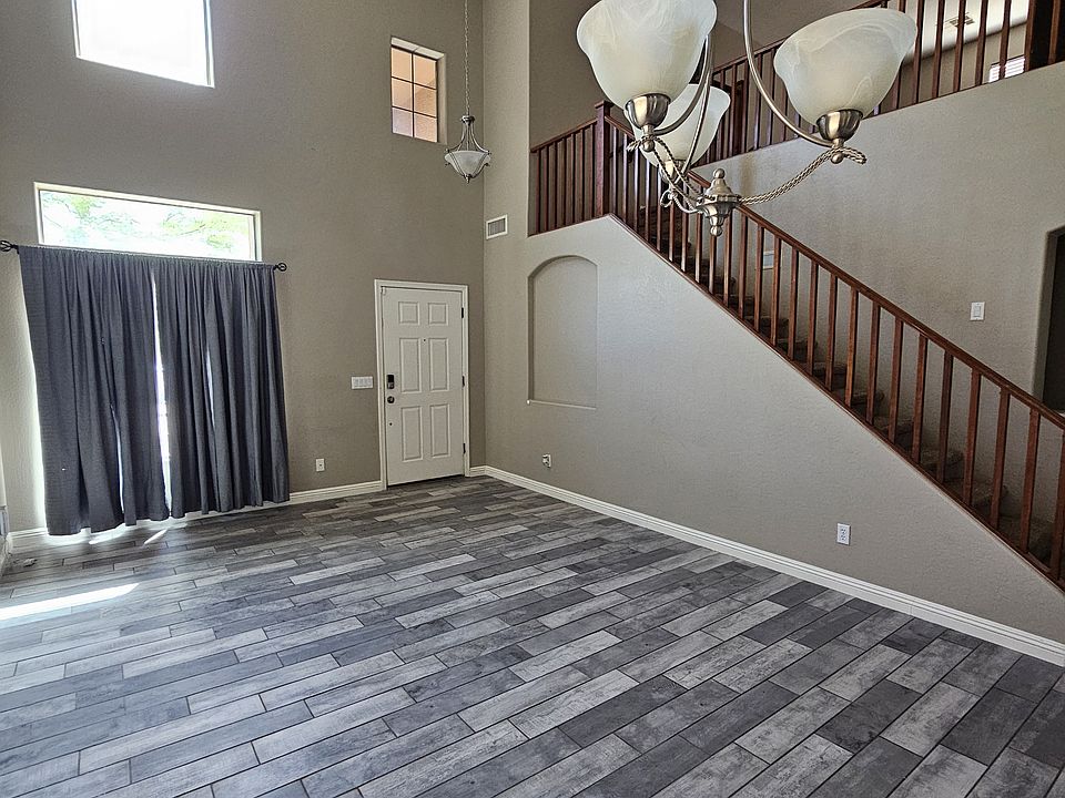 Move in ready 4 bedroom home in great North San Tan Valley location. This home has upgraded cabinets, granite counters, Stainless Steel appliances and an open kitchen with island. One bedroom downstairs with walk in closet, and additional living space upstairs with spacious loft. New flooring on bottom level. The large backyard features covered patio, and 2.5 car garage provides additional storage space.