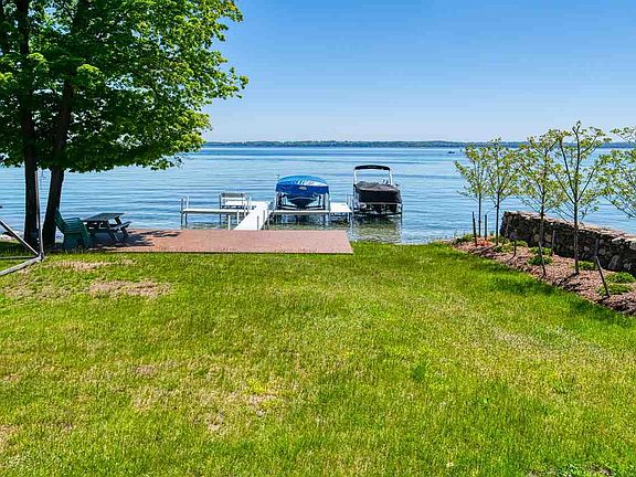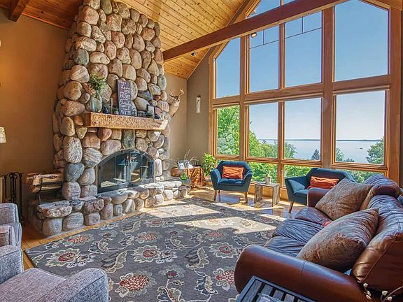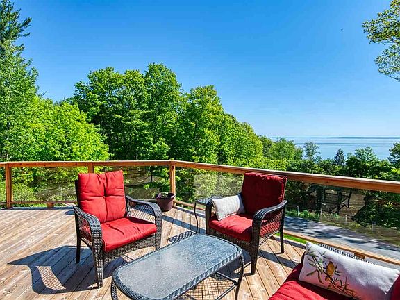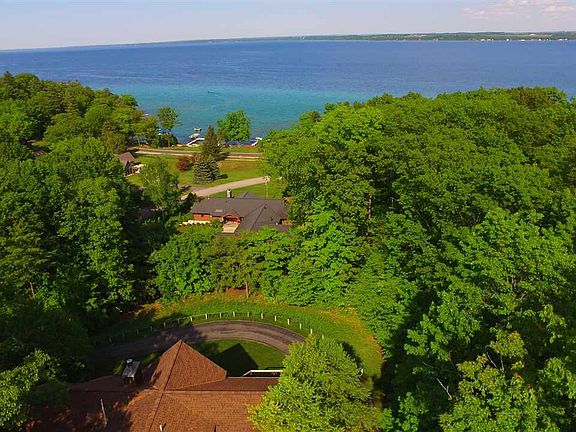 East Bay water-frontage; Gorgeous views; Private setting; Close to town. This home combines all of the best aspects about living on Old Mission Peninsula! The water views greet you as you walk into this custom built home nestled up in the trees. This home has a refined up north feel with vaulted ceilings & tall windows that maximize the stunning water views. Soak up the views from the large deck or head on down to the shared beach/dock to enjoy the water. High end finishes throughout this 4 bedroom/3 bath home exude quiet elegance. Large walkout lower level includes a wet bar, pool room and tons of bonus living space. Three car garage has plenty of room for the toys.