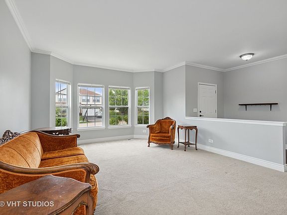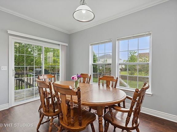 Step inside this beautiful home, freshly painted and new crown molding throughout living, dining and family room. The large foyer opens to huge living/dining room combination that can easily fit a farmhouse table or use it in any variety of ways. The high ceilings make this already large home seem even bigger. Kitchen offers tons of counter space, stainless steel appliances, white cabinets, rich, dark vinyl plank flooring and an eating area that opens to deck. First floor laundry with extra fridge is so convenient. The oversized family room with gas fireplace is light and bright and completes this first floor flow that is perfect for entertaining. Wide staircase leads to open loft area and 3 large ancillary bedrooms all with ceiling fans. The master suite can accommodate the largest bedroom set you can imagine and still have a sitting area that leads to the master bath with soaking tub and a new shower. Massive walk in closet is too big to fill with shoes and could be used as an exercise room, nursery or customize the closet to make it yours. English basement is just waiting to be finished to suit your needs. This home is situated on a quiet corner, with a fenced backyard, a playset that offer a swing set and playhouse that screams adventure time. Money saving solar panels are installed on newer 3 year old roof at no additional cost to new owner.