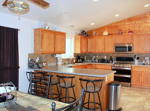 GREAT HOME AT A GREAT VALUE...4 BEDROOMS OR 3 W/ AN IN-LAWS QUARTERS. 3 FULL BATHROOMS. 4TH BEDROOMS HAS GARAGE ACCESS AND AN OVERSIZED WALK-IN CLOSET. LARGE LIVING ROOM/DINING ROOM WITH VAULTED CEILINGS AND KNOTTY PINE TONGUE AND GROVE ACCENTS. STONE GAS FIREPLACE FOR TAKING THE EVENING CHILL OUT. KITCHEN/DINING ROOM WITH A BREAKFAST BAR, STAINLESS STEEL APPLIANCES, GAS STOVE, LARGE PANTRY, TILE BACK SPLASH WITH TILE FLOORING. DECK OFF THE DINING ROOM WITH ACCESS TO THE BACKYARD MASTER SUITE W/ A FULL BATH AND TWO ADDITIONAL BEDROOMS AND BATHROOM ON THE MAIN LEVEL. FOYER ENTRY AND SECURITY SYSTEM. OVERSIZED DEEP 2 CAR GARAGE. COMPLETELY LEVEL USABLE FENCED BACKYARD WITH STREET ACCESS. RV PARKING WITH RV, HOOKUPS. FORCED AIR AND SWAMP COOLING. ROOF HAS RECENTLY BEEN REPLACED. NO HOA!