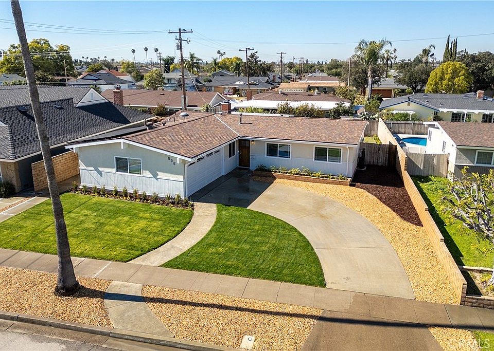 Welcome to 606 N Wrightwood Dr, nestled in the sought-after East Orange neighborhood. This delightful single-story home spans approximately 1400 sqft and rests on a spacious 7200 sqft lot, boasting captivating curb appeal and a convenient two-car garage. Upon entry, a welcoming foyer leads to the cozy living room, adorned with a charming fireplace, recessed lighting, and a sliding glass door inviting abundant natural light and seamless indoor-outdoor living. The heart of the home lies in the kitchen, adorned with stained maple cabinets, sleek granite countertops extending to a breakfast bar, elegant tile flooring, stainless steel appliances, and recessed lighting, creating a perfect space for culinary endeavors and gathering with loved ones. Adjacent, the dining room, enhanced by a ceiling fan, offers another sliding glass door, leading to a generously-sized patio area, ideal for alfresco dining and entertaining guests. Retreat to the primary bedroom, a spacious haven featuring an attached bath boasting dual sinks, stained maple cabinets, and tasteful tile flooring. Three additional bedrooms, all adorned with ceiling fans, provide ample accommodation options, with one featuring its own attached bath for added convenience and privacy. The expansive backyard oasis beckons with lush greenery, a sprawling grassy area, and a serene concrete patio complemented by an Alumawood cover, offering the perfect setting for outdoor relaxation and recreation. Additional highlights of this meticulously maintained home include scraped ceilings, gleaming wood floors throughout most rooms, an inside laundry room, rain gutters, a water softener, newer windows installed in 2016, a newer roof installed in 2017, and the added bonus of a PAID OFF Solar system. Conveniently located near top-rated schools, vibrant shopping destinations, and easy freeway access, this exceptional property offers an unparalleled opportunity to experience quintessential Southern California living at its finest. Don't miss your chance to make 606 N Wrightwood Dr your forever home!