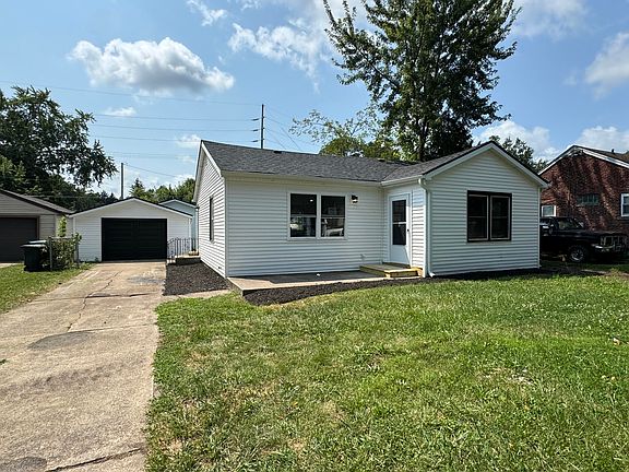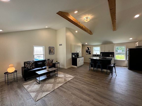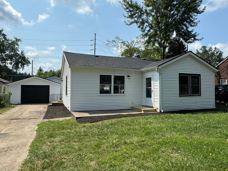 Everything is new in this Ranch home updated inside and out with MASSIVE detached barn-sized garage. Rehab professionally designed and executed. Our main level features custom cathedral ceiling with wood beam design accent and an open concept kitchen that provides additional seating and the perfect space to prep and enjoy home-cooked meals. nautical-themed shiplap adds color and character and matches the custom granite counters. Main level features two bedrooms and one full bath with details that will delight! This home also offers a fully finished basement with living room, bedroom with full egress window, a full bathroom, and separate laundry. This home has been extensively updated from the frame up with new siding, roof, gutters outside and plumbing, electrical, drywall, kitchen, new HVAC (furnace and AC), and bathrooms inside. The basement was professionally waterproofed prior to finishing (warranty included). The detached garage is oversized and offers lots of space for storage and workspace. Enjoy Low taxes, ample living space, and premium design features everyday!