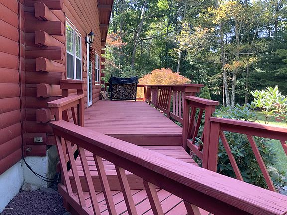Beautiful log home on 1.07 acres, located in town, but out of town at the same time. NO HOA! Property has a French drain, and many upgrades. Flat cleared yard would be perfect for a family gathering. Loaded with rustic charm that only a log home can give. Hand cut stone chimney wall backs a woodstove that heats the whole house, and even has a skylight. Large kitchen with eating area & center island. Master bedroom comes with private bath and a mini split unit. The beams on the ceiling is a look that makes everything fall into place for a cozy feeling. The basement has a walk out, and the house also includes a screened in sunroom/family room with a gas stove. Enjoy your dinners on the large back deck to encompass the view.