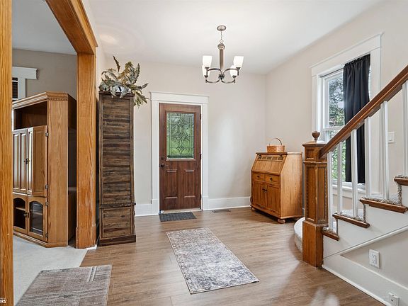 Stately two-story home with updated vinyl windows, a large living room, kitchen that offers ample cabinetry and counter space. The main level offers a spacious entryway, half bath, and a breezeway from the attached one-car garage. Upper level features 3 bedrooms and a full bath with tiled floor and tiled shower. The lower level offers more useable space, built-in storage, and laundry and has an epoxy floor for easy clean up.