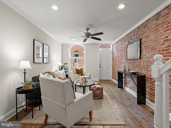 Introducing a beautifully updated 3-bedroom, 3.5-bathroom row home where classic charm and contemporary style blend seamlessly. The open-concept main level features a fresh neutral palette, rich hardwood floors, and striking exposed brick walls that add warmth and character. The inviting living room, enhanced by crown molding, flows effortlessly into the dining area—perfect for both everyday living and entertaining. Your culinary skills will shine in the gourmet eat-in kitchen, complete with stainless steel appliances, gleaming quartz countertops, a waterfall center island accented by pendant lighting, and a decorative tile backsplash. A stylish powder room and direct access to the rear parking pad add convenience to this thoughtfully designed space. Upstairs, the serene sleeping quarters include a primary suite with an updated en suite bathroom featuring a walk-in shower with frameless glass doors. This level also offers a second bedroom, a full bath, a laundry area, and access to a stunning rooftop deck—ideal for relaxing or entertaining with skyline views. The finished lower level provides a third bedroom, an additional full bath, and a versatile bonus room—perfect for a home office, gym, or creative space. With the updates, location, and the 4 years remaining on the CHAP tax credit, this home has it all! Situated in the heart of vibrant Canton, this home offers easy access to top-rated dining, shopping, and major commuter routes. A true gem that combines modern comforts with timeless appeal.