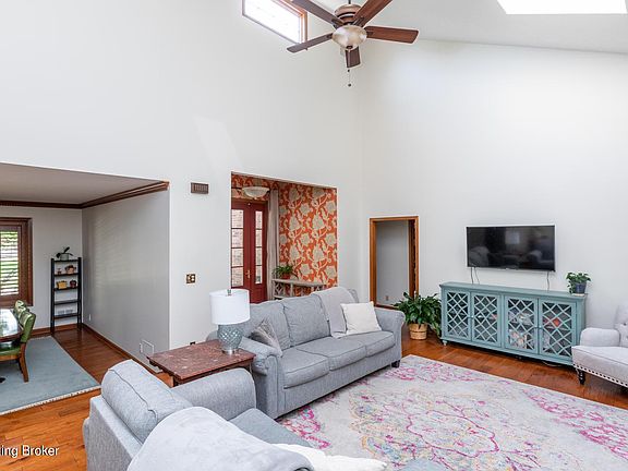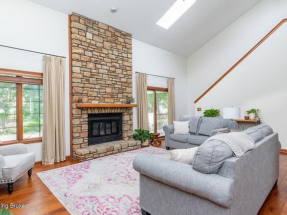 Gorgeous 4 bedroom, 2 1/2 bath home with a 2 car attached garage centrally located near Middletown and St. Matthews! This former Homearama home has plenty of updates and stylish charm to go along. You will love the curb appeal as you approach the entryway with stone and brick walls with a glass panel door and sidelights. As you pass through the foyer into the living room you will notice the abundance of natural light coming from skylights and large windows. The soaring shed ceiling gives off a spacious feel while the stone fireplace and chimney maintain the cozy vibe of this room. The eat-in kitchen has plenty of cabinet and counter space along with a convenient island, perfect for prepping meals. There are 3 bedrooms on the first floor as well as a full and half bath. Upstairs you will