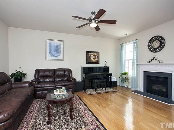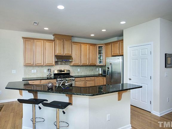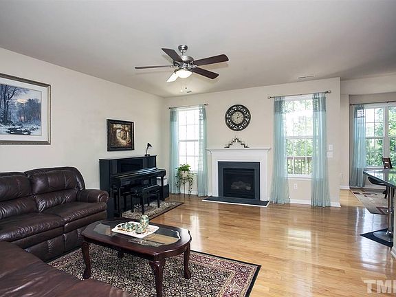 Extremely well cared for 4 bedroom, 3.5 bath townhome with 2 car garage backing to heavily wooded buffer. Bright open floorplan with hardwoods on 1st floor. Eat-in kitchen has raised bar, wood cabs, granite, gas range, pantry. Lg master has trey ceiling, his/hers closets, double vanity, separate shower. Spacious secondary bedrooms. Finished basement ideal for extended guest living with bedroom, large bonus room and full bath. Lovely wooded views. N'borhood pool. Close to RTP, RDU, shopping, dining.