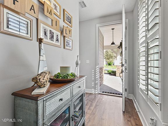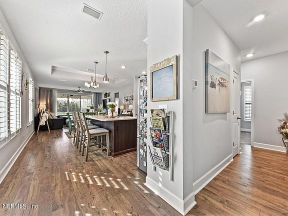 LOCATION! NOCATEE Home in Twenty Mile Crossing - WALKING distance to the Palm Valley K-8 Path to the school. Cul de Sac location. This Charming 3 Bedroom, 2 Bathroom home with upgraded kitchen, island, dining and family room sits on an oversized lot with 15ft of space on one side (total of 30 ft between the homes) and WATER to PRESERVE backyard! Enjoy many upgrades throughout to include LVP flooring in all main areas, upgraded kitchen cabinets and countertops, gourmet kitchen with oven/microwave tower, four burner gas cooktop, two tone cabinets (Island in cocoa color and surround cabinets linen), upgraded lighting fixtures, ceiling fans, PLANTATION shutters, sliding glass door to screened in covered lanai. Tray Ceiling in Primary Bedroom, Super Shower with THREE shower heads - two regular ones and one RAIN shower head. Double sinks in primary bathroom with solid surface. Walk in primary closet, Views of the water from the bedroom. Enjoy two more bedrooms and one more bathroom with upgraded countertop, two sinks and separate shower area. Laundry room has a window and room for cleaning supplies. Two car garage and nice front porch compete this home. Lots of natural light! Enjoy morning coffee sitting on the back lanai watching the beautiful view of the water and preserve. WALK to the Palm Valley Academy K-8 St Johns county school. Enjoy Twenty Mile amenities to include, Pool, Dog Park, Green Space, Playground and Pavilion and enjoy all of the Nocatee amenities to include Spray Park, Splash Park, Greenway, Basketball, Soccer fields, Tennis Courts, Pickle Ball courts, Gym, Jr Olympic heated pool and all of the Nocatee activities.