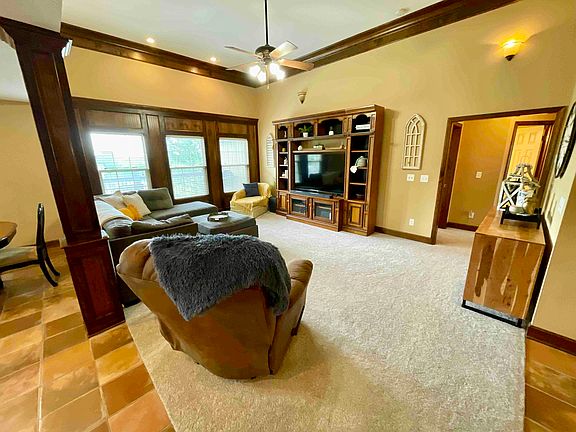 Stunning brick and stone front ranch with a fully finished walkout basement, tucked away in peaceful Pleasant Hill! This home is ideal for entertaining, featuring 12-foot ceilings in the entryway, beautiful trim work, crown molding, and ceiling beams that define an inviting open-concept kitchen, dining, and living space. The kitchen, dining, and hearth areas are fully tiled and include custom cabinetry with pull-out shelves and a built-in coffee bar.