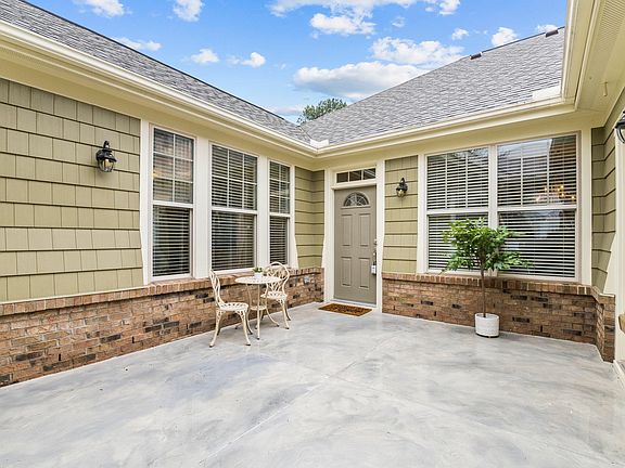 Lovely 1-Level NE facing Home in Cary designed by Martha Stewart. Unique details throughout -- stamped driveway, a welcoming yet private courtyard, split bedroom layout, seperate dining space, a spacious kitchen with plentiful granite countertops, dual ovens, gas stove, breakfast nook, a large family room with lots of windows that overlooks Hatchs Pond, and a quiet study/office area with built-in bookshelves. Enjoy sitting on the screen porch and watching the ducks swim in the pond. The primary bedroom boasts bay windows with a pond view, spa-like bath with a garden tub and tiled shower stall, dual vanities & a huge walk-in closet. *New Roof- 2022, Leaf Guard protection-2020, 2021- New Hot Water Heater, New Lenox Pureair/Honeywell Wifi thermostat-2020 plus an irrigation system, amazing community, pool, tennis & playground. Google Fiber available. Greenway trails, close to RTP & RDU & Trader Joe's and within walking distance to Wegmans.