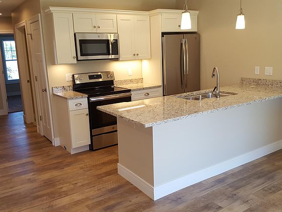 New 900+ Sq ft single level townhouse. Two bedroom, one bath and separate laundry/furnace room. Large open great room/kitchen area with 9' tray ceilings, gas fireplace and doorwall to patio area. Open kitchen with stainless steel appliances, granite tops and pantry. Attached 1-1/2 car garage. Nice rural setting on west side less than 10 minutes to hospital. No pets or smoking. Tenant is responsible for electric, natural gas and cable