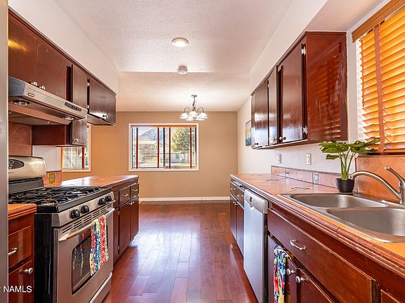 Move-in ready! This single-level home in the ever-popular Smokerise neighborhood offers many special upgrades and features.Beautiful touches include custom countertops in kitchen, primary bathroom with natural stone work in a generously sized walk-in shower, and a lovely sliding mirror.Gorgeous double-door cast iron woodstove insert warms the second living area. Sliding glass doors open to a large patio, fully fenced backyard with sitting area, and a fenced dog run/ play area.Newly landscaped front and back, new water heater, new furnace, new garage door opener, new can lighting in primary bedroom and garage.Smokerise is minutes away from shopping, dining and entertainment. This home has beautiful views of Sheep Hill and Mount Elden as well as quick access to biking/hiking trails a