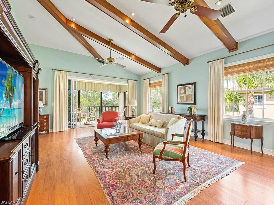 C9456 - Elegant, updated and spacious second floor condo home boasting it’s own private elevator. The updated kitchen features plenty of cabinet space, meal prep areas and a large pantry. The primary bathroom has been updated. There is custom shelving in the owners closet. Classic rich wood beams draw your eye up to the vaulted ceiling in the main living space. The view is beautiful, tranquil and offers diffused late day sun out of the West. Turnberry Woods was the last condo neighborhood constructed in The Strand and uniquely offers a natural pleasant setting with buildings on only one side of the street. Makes it easy to get in and out of your driveway! Enjoy a friendly, active country club lifestyle, complete with 3 beautifully maintained 9 hole golf courses, tennis, pickleball, fitness center, and an impressive pool with lap lanes. There are newer bocce courts, as well as a recently added croquet center, Island Bar and the all new Tavern 59 for residents to enjoy. Located within a short drive of many dining and shopping conveniences, and the sugar-sand beaches on the Gulf.