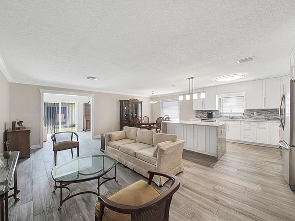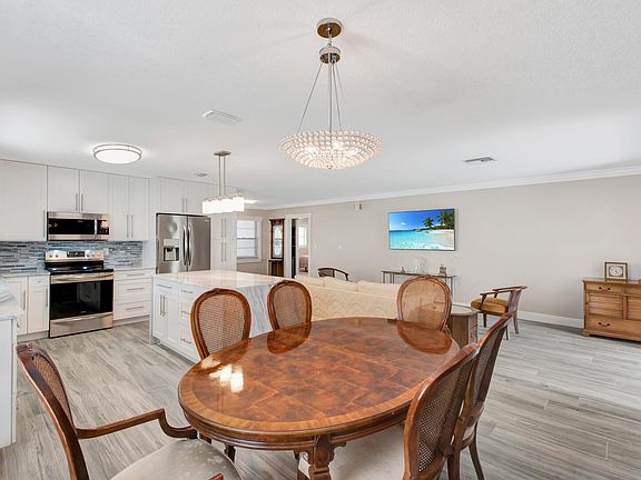 Welcome to this beautifully updated 2-bedroom, 2-bath villa in the desirable Delray Villas community! This open-concept home features a spacious living room and dining area, highlighted by wood-look tile flooring, crown molding, and smooth walls for a modern, polished look. The bonus room, filled with natural light from its many windows, offers a versatile space perfect for relaxing or working from home. Plus, the furniture is available for purchase, making this home move-in ready and effortlessly stylish! The recently remodeled dream kitchen showcases modern white cabinetry, natural-stone countertops, a stylish tiled backsplash, stainless steel appliances, and a convenient snack bar for casual dining and entertaining. The primary suite is a true retreat, offering dual closets and an updated ensuite bath with a walk-in shower and a sleek LED-lighted mirror. This home has been thoughtfully designed for accessibility, with widened doorways to meet wheelchair accessibility codes.
