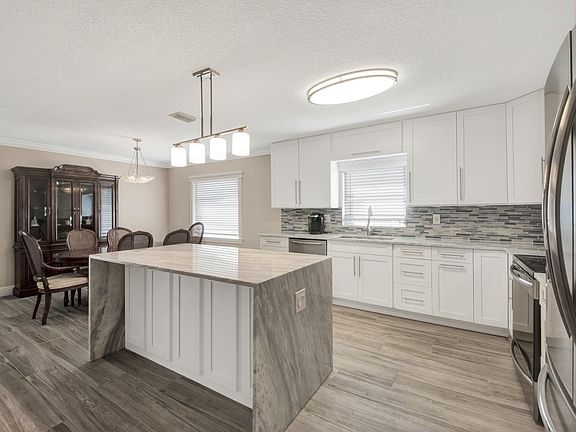Additional upgrades include a new washer, A/C, and a garage with epoxy flooring, a utility sink, and pull-down stairs for easy attic access. Accordion shutters provide storm protection, and the screen-enclosed front entrance allows you to enjoy the outdoors in comfort.