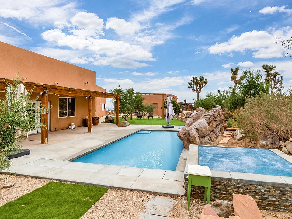 The exterior features a pool and jacuzzi with a water slide. There is a swing set for people's enjoyment. The home sits on top of a valley so you have amazing dessert views.