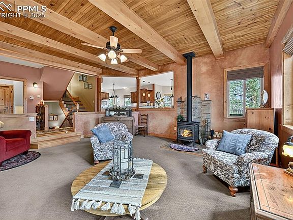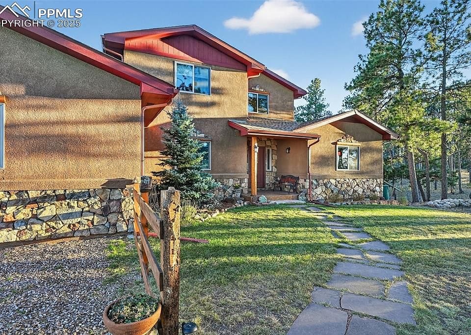 Welcome to your own private sanctuary nestled among towering Ponderosa pines in the heart of Black Forest, Colorado. Set on five beautifully treed acres, this custom-built home embodies the best of Colorado living—peaceful, private, and perfectly connected to nature, yet just minutes from the conveniences of Colorado Springs and Monument. Step inside and immediately feel the difference between a house and a home. Sunlight streams through every window, inviting the outdoors in and framing serene forest views. Every detail reflects craftsmanship and warmth—from solid hickory and oak flooring to handcrafted wood trim, beechwood cabinetry, and solid wood doors. Thoughtful touches and a hint of vintage charm create a sense of timeless comfort throughout. The spacious layout offers room to breathe and grow, with three oversized bedrooms and four bathrooms, including a luxurious primary suite featuring a custom soaking tub perfectly positioned for moonlit views. Cozy up by the wood-burning stove in the main living room as snow falls softly outside, or enjoy the charming den with its vintage oak mantel and gas-flame stove, ideal for quiet evenings at home. Upstairs, a versatile loft area provides extra space for work or play, while the walk-out lower level serves as the perfect recreation area—complete with a full bath, ample storage, and the potential to add another bedroom in the future. Step outdoors and embrace the true Black Forest lifestyle: evenings under the stars beside your custom milled-pine pergola, sipping your favorite drink as the sun sets across the pines. A fenced garden grows golden raspberries and currants, while a large, fenced yard allows pets to roam freely. Whether you’re dreaming of hobby farming, forest walks, or simply a peaceful retreat, this home captures it all. Located minutes from Black Forest Regional Park and local schools, it offers the perfect blend of tranquility, beauty, and community. Come make this house your home!