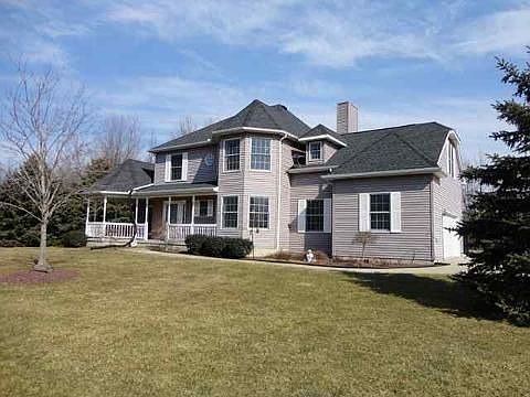 Great Victorian-style home with custom vinyl siding and open floor plan on private 10-plus-acre setting with abundant wildlife. 12-foot ceilings in living room and family room. Master bedroom features doorwall to personal balcony; adjoining bath has Jacuzzi tub as well as a shower. Updates include high-efficiency furnace, A/C, Trex decking, underground electric dog fencing, newer well pump and shingles on home. Check out the Virtual Tour for panoramic photos of the house and property!