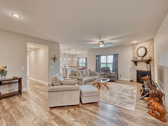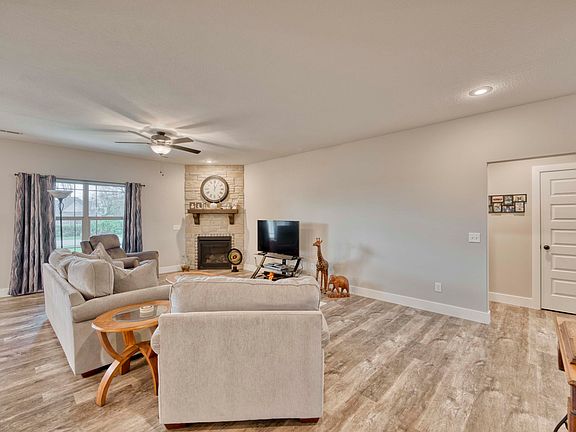Beautiful, one level, all brick with stone accents, Bussell built home in Green Ridge Estates! Built in 2022, this property shows like a brand new home offering 3 bedrooms, two full baths, office and 3 car garage. Beamed covered front porch as well as an upgraded front door. Corner lot. You'll love the feel that open, split bedroom floor plan offers! Easy to maintain, vinyl plank flooring throughout the main living areas. The living room has a gas fireplace - stone w/ cedar mantle with a plug in for your tv. The kitchen has custom built, shaker style white cabinetry, center island, and stainless appliance. Big walk-in pantry offers lots of extra storage. Built in mudroom bench, separate laundry room. Nice size primary bedroom. The primary bath has dual sinks, tiled walk-in shower and a walk-in closet. Spanish pecan stained cabinets throughout the rest of the home. Covered back porch and sprinkler system.