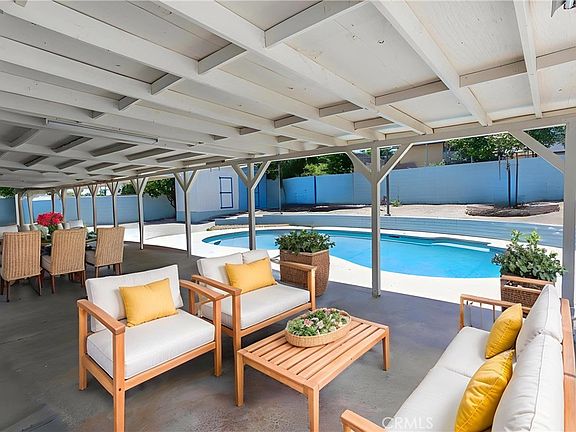 The backyard is perfect for relaxing or entertaining. Enjoy summer days by the sparkling pool, shaded afternoons under the expansive covered patio that stretches the length of the house, and the convenience of two detached storage units for your extra belongings. The property has block fence all around back yard.