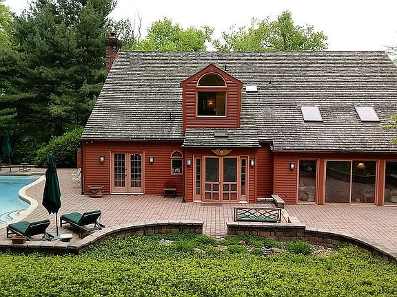 Privately situated on a rise above the road, and tucked into a maturely wooded backdrop, is a true Salt Box in the sought after Solebury Township neighborhood of Hidden Valley. Custom built craftsmanship lays an ideal foundation for this warm, inviting and classically inspired home. Rustic, random width pine flooring ties the traditional, yet uniquely flowing floor plan together, upstairs and down. The formal living room, with views over the expansive front lawn, is accented by a beautiful brick fireplace and pocket doors that lead to a generous formal dining room overlooking the in-ground pool. The country kitchen, with rustic solid wood cabinetry; a brick hearth surrounding the cooktop; granite countertops; and French doors leading to the 2,200+ sq ft paver-stone patio, is an inviting hub of the home. The natural woods, built-in cabinetry, brick fireplace and glass wall of the family room with vaulted ceiling combine to create a natural ambiance of relaxed comfort year round. The first floor livability of the home is further enhanced by the main level laundry/powder room and separate mudroom/pantry access from the garage. Upstairs is an en-suite master bedroom of generous proportions featuring the home's third wood burning fireplace, rustic beamed ceiling and a large vaulted ceiling bathroom that has serene views over the private, fenced backyard. A second generous bedroom along with 2 additional bedrooms and a hall bath are nicely separated from the master bedroom by crossing over the two-story entry foyer. In the remarkably private backyard you'll find a significantly sized tiered paver-stone patio and a stone wall accented in-ground pool with a spa-waterfall feature, tucked into a hillside nook. The partially finished basement provides abundant storage and would be ideal as a future media/game room. Especially inviting and warm, this reproduction colonial carries with it a sense of time, character and charm - a gem worthy of your personal enhancements.