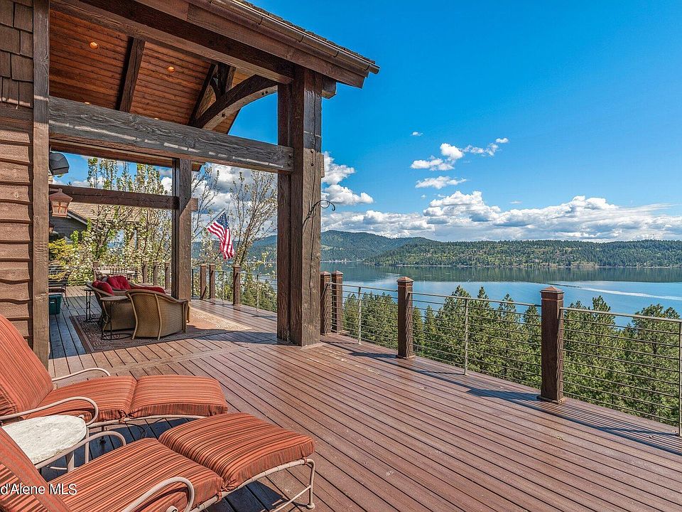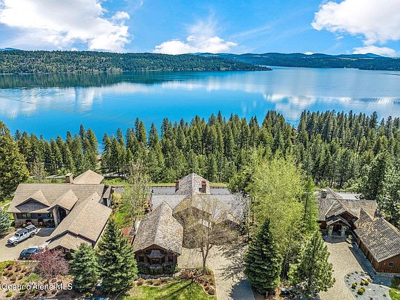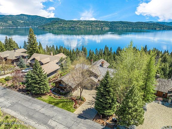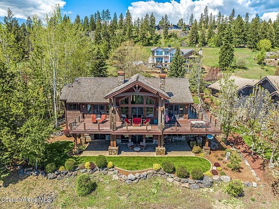 QUINTESSENTIAL LODGE-STYLE HOME WITH PREMIUM LAKE VIEWS AT PRESTIGIOUS BLACK ROCK. Situated on coveted lower Onyx Circle, this custom beauty boasts 4,600 sq ft of living space with 3 bedrooms, 3.5 baths and gorgeous views of Lake Coeur d'Alene at every turn. Open great room features soaring ceilings with curved Caribou timbers & T&G accents, a floor-to-ceiling fireplace with stunning stone masonry and wet bar for entertaining. A well-equipped chef's kitchen and adjacent dining area with direct access to the expansive lake-view deck. Spacious main level master suite retreat and private office. Perfectly suited for extended-stay guests, the walkout lower level includes a family room with stone fireplace, two bedrooms (each ensuite), private laundry and a spacious covered patio. Peaceful, private setting with incredible views and indoor/outdoor living spaces to enjoy. An absolute MUST-SEE at prestigious Black Rock!
