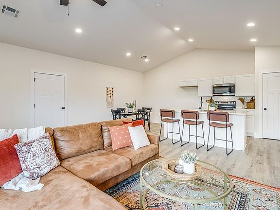 Spacious living area with a covered patio and two car garage. Quartz kitchen and bathroom countertops. Master bedroom with walk in closet and glass shower enclosure with seating. Kitchen features an island and pantry along with stainless steel appliances. Location is close to multiple highway system I-135, gas stations, restaurants, and grocery shopping center. Privacy fence partition and off street parking.
