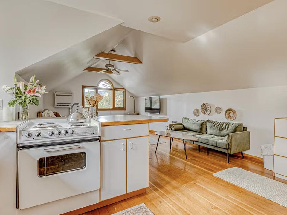 This beautiful, mid-century modern studio is located in the heart of downtown Hood River, within a one minute walk to the best restaurants, bars, food trucks and breweries. Walking distance to the event site for kiting / windsurfing and a short drive to Post Canyon to access mountain biking trails. The studio is well equipped with fast WiFi (100 mbps), a Smart TV and a large yard and patio for you to enjoy. It is typically a short term rental that is being offered on a month-to-month basis with all utilities included. It is perfect remote work or vacation location and is fully furnished with a queen size bed, equipped kitchen and A/C. Relax on the patio and enjoy all that the Gorge has to offer! Available December 1st for month-to-month lease (minimum 3 month lease term). $1895/month. Flat utility charge of $100/month covers all utilities and high-speed internet. Washer and dryer located on site. Parking is available on the street and directly in front of the house in the Columbia Parking Lot.