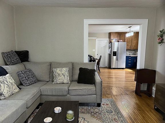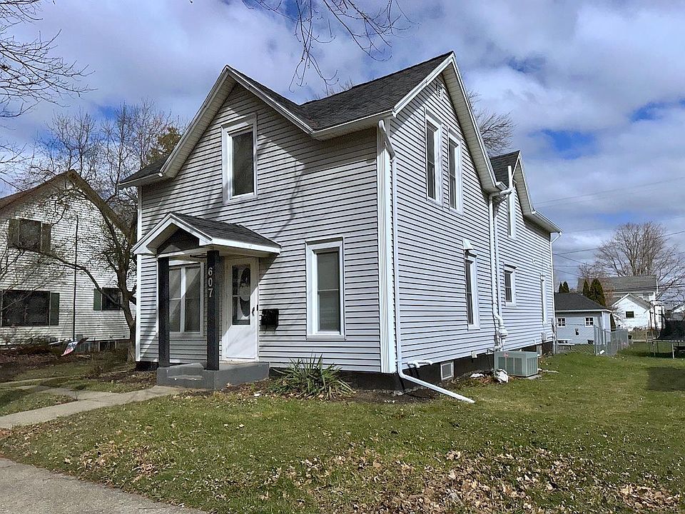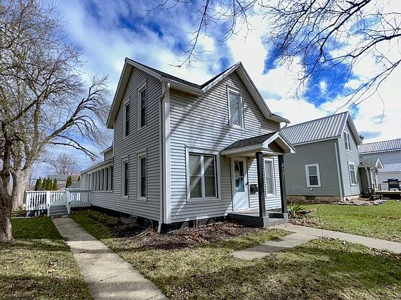 Charming one and a half story home is filled with character and has modern updates. There are refinished original hardwood floors and a beautiful solid wood staircase. The expansive main floor bath and laundry room is complete with large soaking tub, double sink vanity, tile shower, and open shelving. The large eat-in kitchen features stainless steel appliances and farmhouse sink, stone backsplash and accent wall, nice countertops, neutral upper cabinets, navy lower cabinets, and a coffee bar. The second bath on the main features beautiful classic subway tile, newer flooring, and fixtures, along with exposed brick. Upstairs is a large hall closet, and three bedrooms all with updated flooring, light fixtures, built-ins, and neutral wall colors. The exterior has vinyl siding, large gated deck, detached garage off the alley and the backyard is fully fenced in.