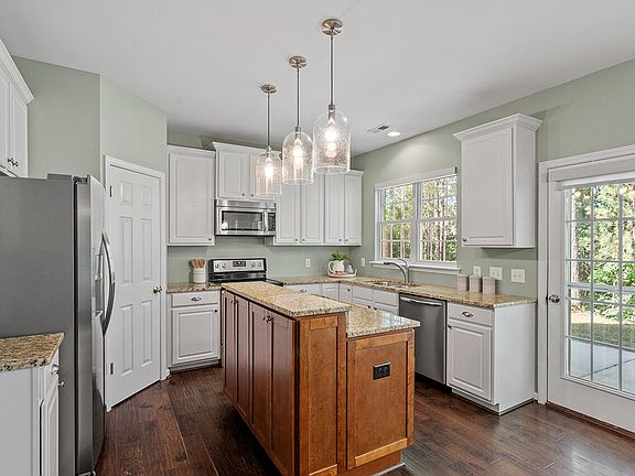 Location is prime! This beautiful EAST facing MOVE IN READY home is located in the highly sought after BRECKENRIDGE subdivision, situated in a CUL-DE-SAC, and BACKING UP TO WOODS AND LAKE providing privacy and tranquility. Beautiful wide plank hardwoods on the main level and upstairs landing with custom tile in the mudroom and laundry room. Kitchen highlights include granite countertops, a custom 2 level island with extensive storage and additional cabinets with clear, textured, bubble glass on top doors. Primary bedroom features a huge walk-in closet, trey ceiling and roller shades. Primary bath updates include a tiled shower, LVP flooring, and motorized black out roller shade (2021). Beautiful, custom wood bookcase on upstairs landing. Laundry room with cabinets, shelving and recessed lighting. Well established landscaping with raised garden. Sit on your extended concrete patio in back and relax to the soothing sound of the fountain on the lake. Freshly painted front door and most of the interior (June 2024). New light fixtures- foyer, dining room, kitchen island, breakfast area (May 2024), Carpets professionally cleaned (June 2024). Close to RTP (Research Triangle Park), Future Apple Campus, RDU Airport, Shopping, Grocery Stores and Restaurants. Breckenridge Community offers a pool, 5 tennis courts, playground, pond, trails and clubhouse. Washer, dryer, refrigerator, curtains, roller shades and Ring doorbell convey.