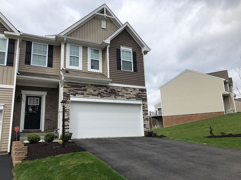 Conveniently located in the corner of Collier Township with easy access to Route 79 and Interstate 379 (Parkway West), this townhome is just minutes to both downtown Pittsburgh, the Pittsburgh International Airport or shopping in Robinson. This 2687 square foot Maronda built end unit is the largest of the St Anthony Models with the 2 story addition on the back of unit so there is a full height dining area (not sloped as in other units) as well as a full large master bath above. Open floor plan in main living area (great for entertaining!) and all hardwood was extended on first floor beyond what Maronda usually provides at our request before construction was completed. Kitchen was renovated to include extra tall 30” wide 96” high cabinet on far end to hold microwave and provide extra storage. Stainless drop down vent hood was added over magnetic induction cooktop. Drop down pendant lights were added above the island over the sink as well as glass tile backsplash and under cabinet lighting. All standard builder appliances were removed and replaced with high end stainless appliances (over $10,000). New washer and dryer installed along with white shaker cabinetry and other features in laundry room (this is not included normally in Maronda townhome). Additional landscaping added outside. Rough in plumbing in basement for full bath and bar as well as to add second laundry. Beautiful neutral grey-beige (greige) paint throughout makes decorating easy. We would be leaving ALL appliances including refrigerator, microwave AND washer/dryer (ALL just 3 years young!!! – new when we purchased new townhouse and includedin price above). If you like our furniture/decor, we would negotiate leaving some of it including 82” TV mounted on wall in living area. Type: 2 level (plus basement) Townhouse End Unit Year Built: 2018 (last section built in development)Builder: Maronda St Anthony Model Brick/Siding Garage: Double with Opener Bedrooms: 3 very large Baths: 2 full, 1 half (potential 3rd full in basement)Storage: 2 walk-in closets master, basement Laundry: 2nd floorHeat type: Gas, Forced Air Cooling: Central AirBasement/Game room: Walk out/Daylight Floors: hardwood on 1st floor, Wall to Wall, Vinyl tile Great Room/kitchen: 27’6” x 19’3” Dining Room: 11’6”x 10’ Master Bedroom: 21’7’ x 15’3” Master Bath 11’6” x 10’ 2nd Bedroom: 13’1” x 11’2” 3rd Bedroom 14’4” x 11’6”