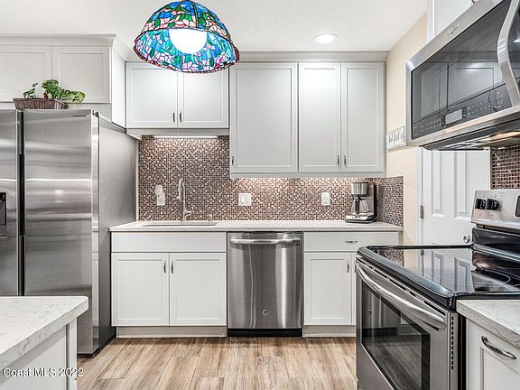 Fetching 1st-flr condo delightfully updated w/a tankless WH, a 2-yr-old electric panel & modern finishes! Wood-look tile floors span the easy-flow great rm plan. Double sliders off the living & dining areas lead to a breezy screened porch overlooking an open-air patio & leafy trees. A colorful tile backsplash complements the kitchen's marbled quartz counters, crisp white cabinetry, floating shelves & chic SS appliances. Featuring a walk-in closet & tiled shower bath, the primary suite is a comfortable retreat. The 2nd bdrm & separate stylish tub/shower bath offer ample accommodations for guests. This extra bdrm would also make an ideal office. Accordion shutters for ease during a storm. Handy interior laundry rm & 1-car garage included! Enjoy a community pool, tennis, gym, sauna & hot tub! tub!