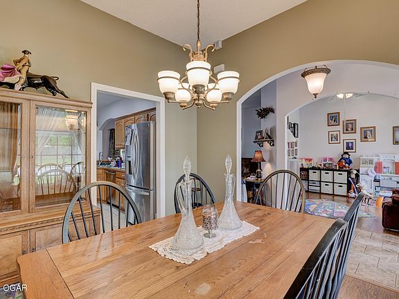 So much to love with the large yard! Patio covered, storm shelter, fire pit with rock outdoor fireplace. Lattice topped pergola has vines of wisteria. Two story playhouse with sandbox hides under a huge weeping willow tree. Lots of room for games and fun. Spacious home has eat-in kitchen plus formal dining. Office area off foyer. Large master suite with garden tub and walking closet. Also R.V. pad with electric hookups.