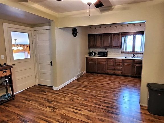 Check out this cute 2 bdrm 1 bath home featuring a large open kitchen and living area. Nice sized main floor bedroom along with a full bath. Living room features large picture windows to allow tons of natural lighting. Large Rustic bedroom upstairs with lots of storage. Main floor laundry located in the entry way with lots of storage next to an enclosed patio. Single car detached garage, with a large fenced in yard. There is a half bath located in the basement that is not currently being used but could easily be put back into service.