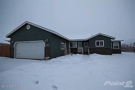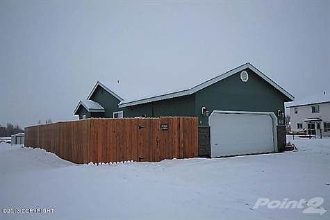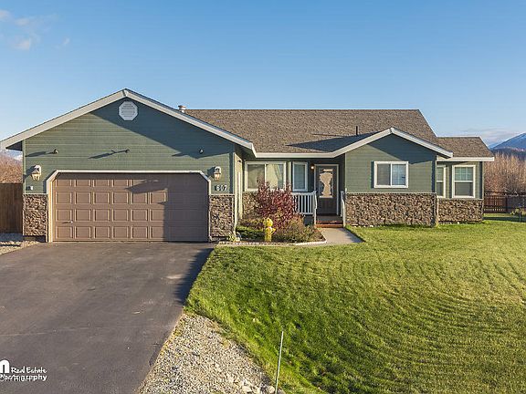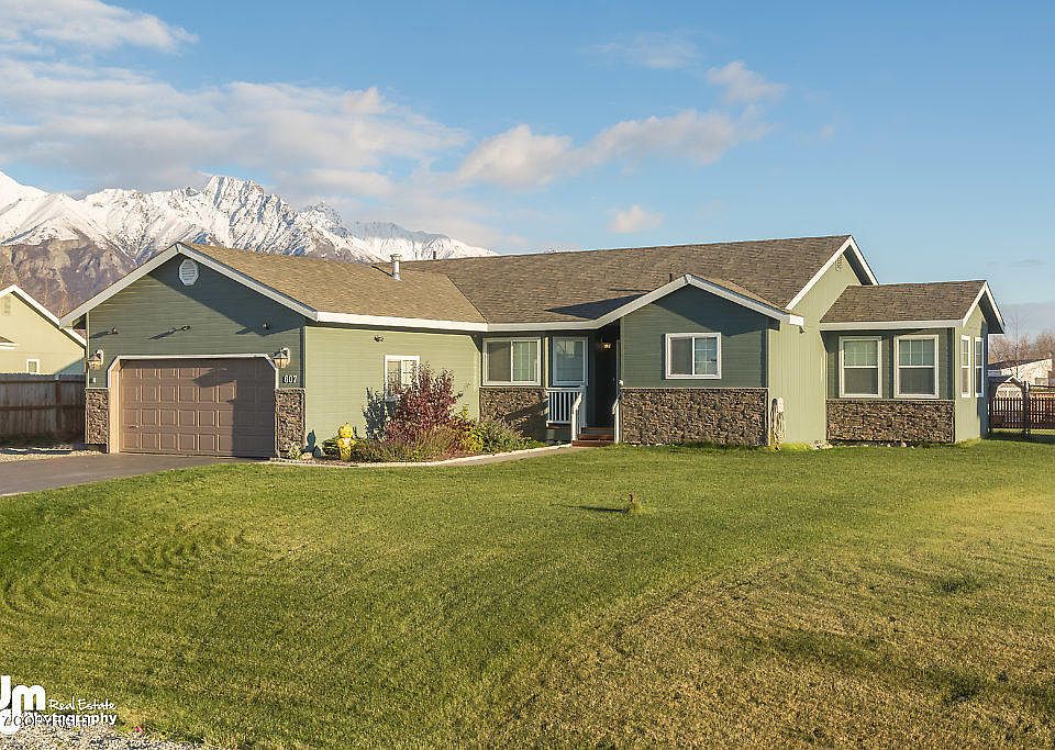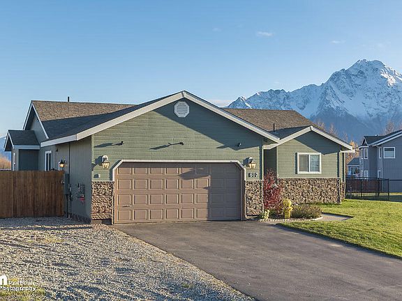Prime Alaskan property with gorgeous unobstructed mountain views! Perfect location for commuters & close to shopping & schools. Huge landscaped fenced in back yard with firepit, RV parking area, paved driveway, shed & lovely landscaped front yard. Open layout, laminate flooring, vaulted ceilings, gas fireplace, bay window in master bdrm, hickory cabinets & sun room area off dining space.