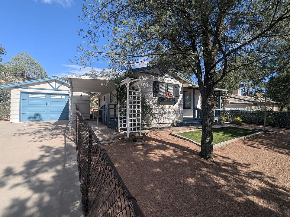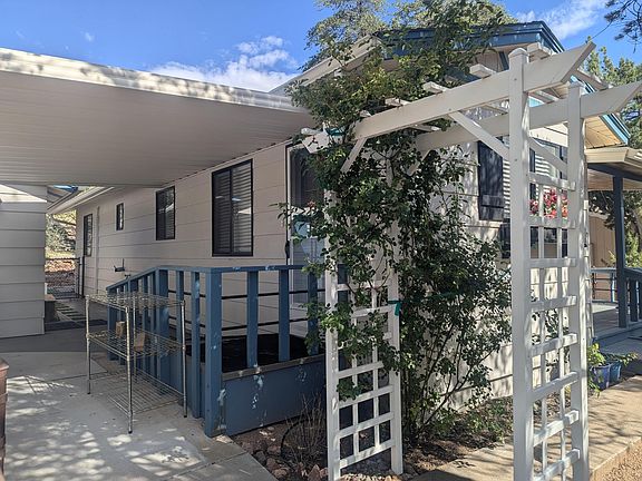 Each room has it's own mini split heating/cooling unit (installed Sept. 2023) so you can zone each room to it's desired temperature while saving on your utility bills. Each room also has baseboard heating if preferred. Hall bath has tub/shower and remodeled sink/vanity. Each bedroom has 2 closets and master bedroom features bedside lamps. Master bath has a sliding barn door, modern shower and remodeled sink/vanity. Laundry room off kitchen has washer/dryer and pantry. The entire home has quality vinyl plank flooring throughout. Roof is only 5 years old with transferable roof warranty. Serene front porch is a great place for morning coffee/tea and enjoying your fenced front yard with beautiful garden and flower beds with automatic watering system. The scenic back patio area has a pad for a hot tub/jacuzzi and has plenty of privacy with views of the hillside and giant boulders. Oversized detached one car garage has storage, workbench, and a spare refrigerator. Extra wide gate and ramp at side entrance through laundry room. Tough shed located behind garage is extra storage. This beautiful home is ready to go and won't last long!
